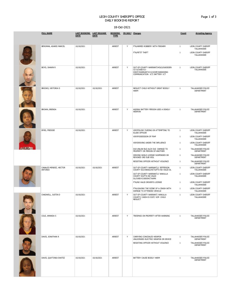 Ate outdoors under the tent. Charges count arresting agency date date type. Attached is a PDF file containing all bookings at the Leon County Detention Facility from Nov.